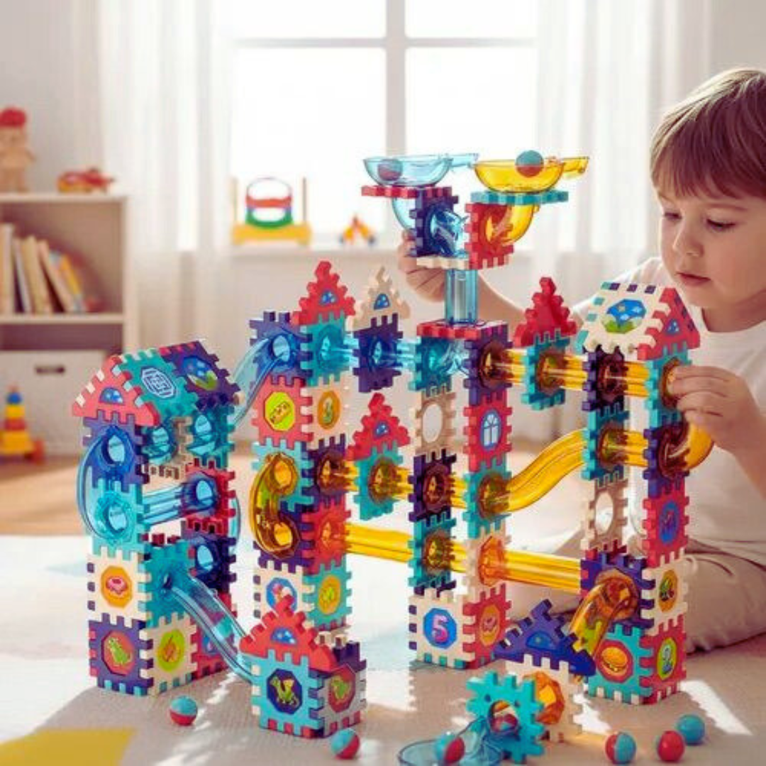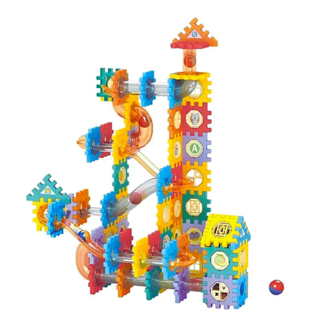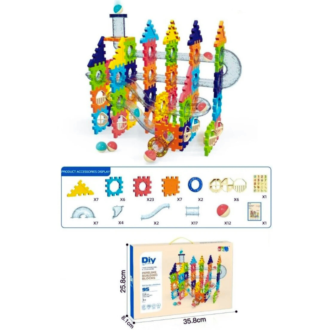 Con 95 piezas coloridas 🌈, tubos transparentes 🔍 y pelotas incluidas 🎾, este set invita a los niños a crear rutas, laberintos, estructuras y circuitos infinitos.